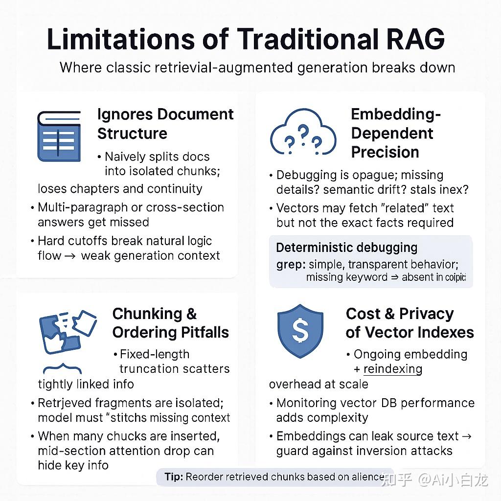 局限:然而,基础RAG系统也存在不少不足。首先,忽视文档结构。经典RAG将文档机械地切成独立片段,丢失了章节层次和上下文连贯性。如果答案涉及多个段落关联或跨章节的信息,简单的相似度检索往往顾及不到。将长文档硬切会破坏其自然逻辑flow,导致模型生成时缺乏重要上下文。其次,检索精度依赖嵌入质量。当向量匹配失灵时,调试问题常变成噩梦——究竟是嵌入向量没表示出关键细节?语义空间偏差?还是索引过期未包含最新内容?。向量检索有时匹配的是大致相关的段落,却未必包含问题所需的具体事实。相反,传统关键字搜索(如grep)行为简单可预期:搜索不到某关键词,就说明文档里没有,这种确定性在诊断检索问题时非常宝贵。再次,段落截断与顺序问题也会影响效果。RAG常按固定长度截断文本,可能把紧密关联的信息分散在不同片段中,导致检索返回的碎片各自孤立,模型难以拼凑完整答。而当检索返回多个片段时,如何排序放入Prompt也有讲究。如果关键内容被排在中间,模型注意力可能不足,出现“中段遗失”现象,大幅降低答案准确率。最后,维护大规模向量索引也有成本与隐私问题:定期嵌入新数据、监控向量库性能都增加复杂度;向量可能泄露原文信息,需要防范embedding反推原文的风险。