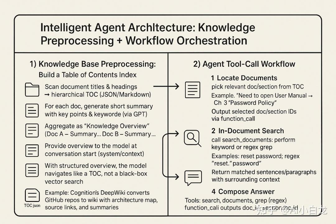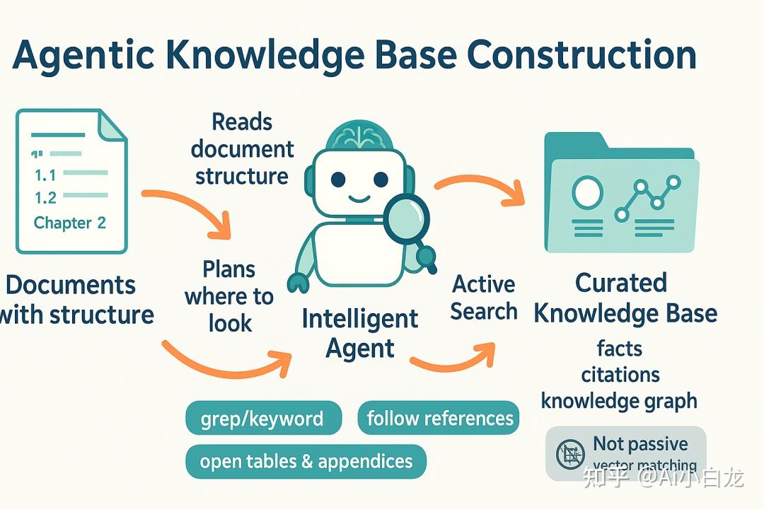 针对上述局限,我们发现利用智能**Agent**(智能体)的方法构建知识库,即赋予大模型类似人类研究员的能力:让它主动“阅读”文档结构,自己决定去哪里查找信息,而非被动依赖向量匹配。其核心思想包括: