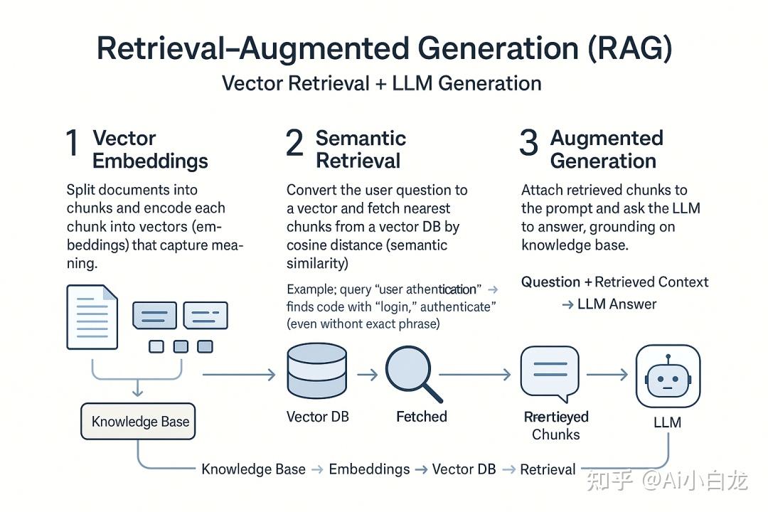 上述流程将LLM与知识库结合,弥补了纯LLM易胡编乱造、知识截止等缺点 。它让AI像搜索引擎一样查资料,又能用自然语言生成结果,已被广泛用于问答助手、代码助手等产品。