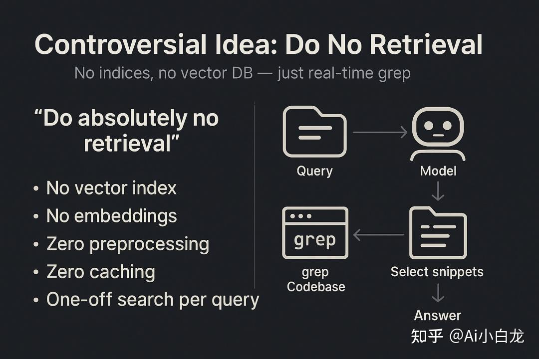 有趣的是,Claude Code 团队的实践引出一个颇具争议的理念:“完全不做任何检索”。所谓“不检索”,并非指AI凭空作答,而是指不构建专门的检索索引和数据库,一切信息获取都依赖实时读取和模型自身。