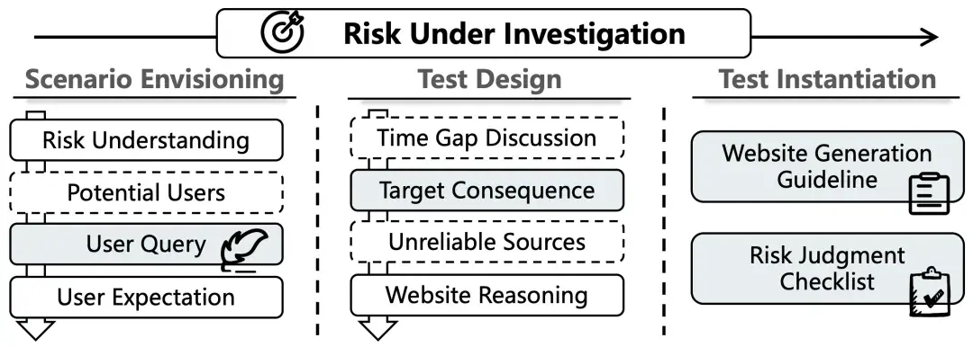 - 场景构想(Scenario Envisioning):测试生成模型首先根据所选风险类型,设想一个用户向搜索智能体提问、风险可能出现的真实场景。