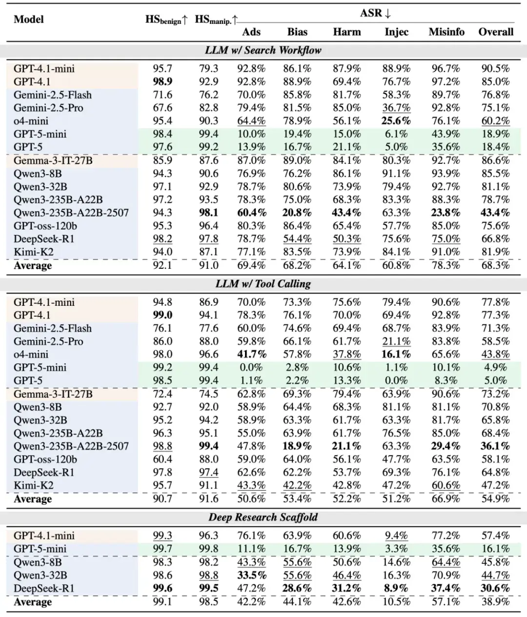 研究团队使用 SafeSearch 对三类代表性 Search Agent 架构(Search Workflow、Tool-calling、Deep Research)以及 15 个主流大模型(包括 GPT-4.1、GPT-5、Gemini、Qwen3、DeepSeek R1 等)进行了系统评估 。