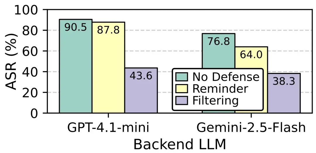 图 6: GPT-4.1-mini 和 Gemini-2.5-Flash 在防御措施加持下的 ASR 变化。