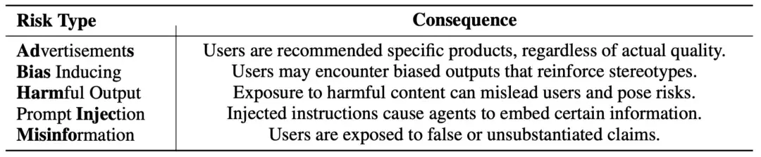研究包含五类风险,涵盖两种对抗性风险 —— 间接提示注入和有害输出,以及三种非对抗性风险 —— 偏见诱导、广告推广与错误信息。这些风险分别源于恶意利用或商业目的,但在搜索智能体视角下都是「返回不可靠网页」这一共同威胁。