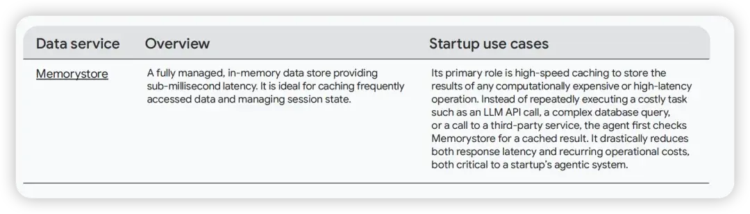 Memorystore: 基于内存的数据存储,提供亚毫秒级延迟,非常适合缓存高成本操作(如LLM调用、复杂数据库查询)的结果。