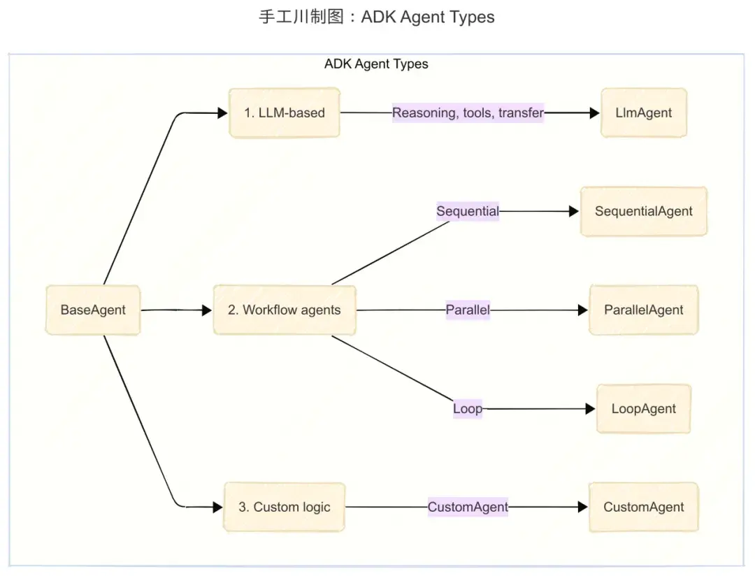 在ADK中,选择正确的Agent架构是第一步。这通常是在LLM的灵活性和硬编码逻辑的确定性之间做权衡。