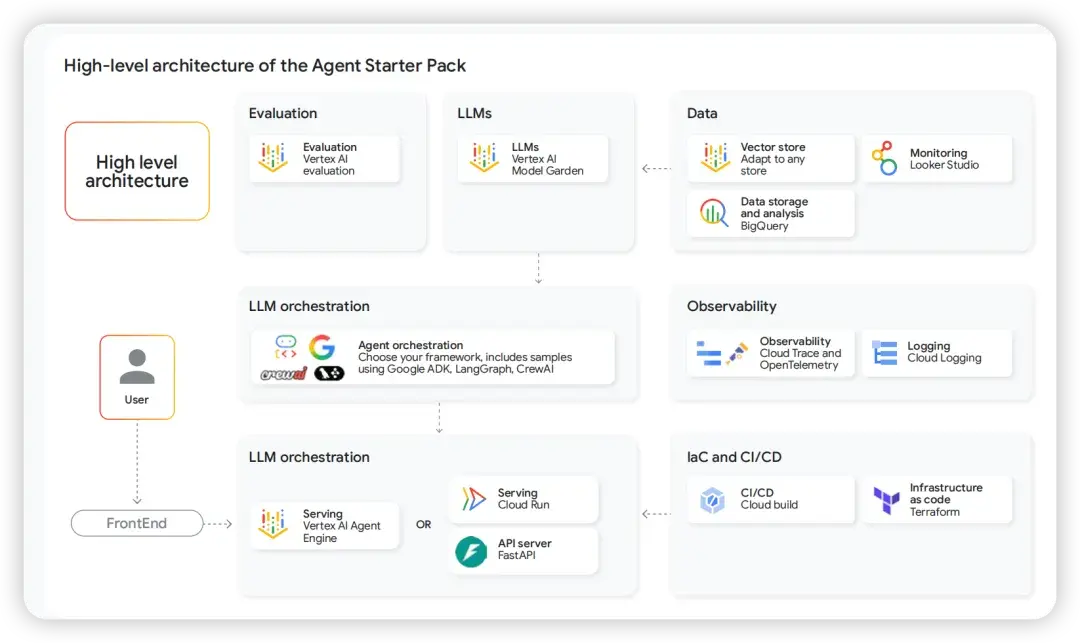 - Agent Starter Pack负责:Agent的运营环境(基础设施即代码Terraform、CI/CD流水线Cloud Build等)。