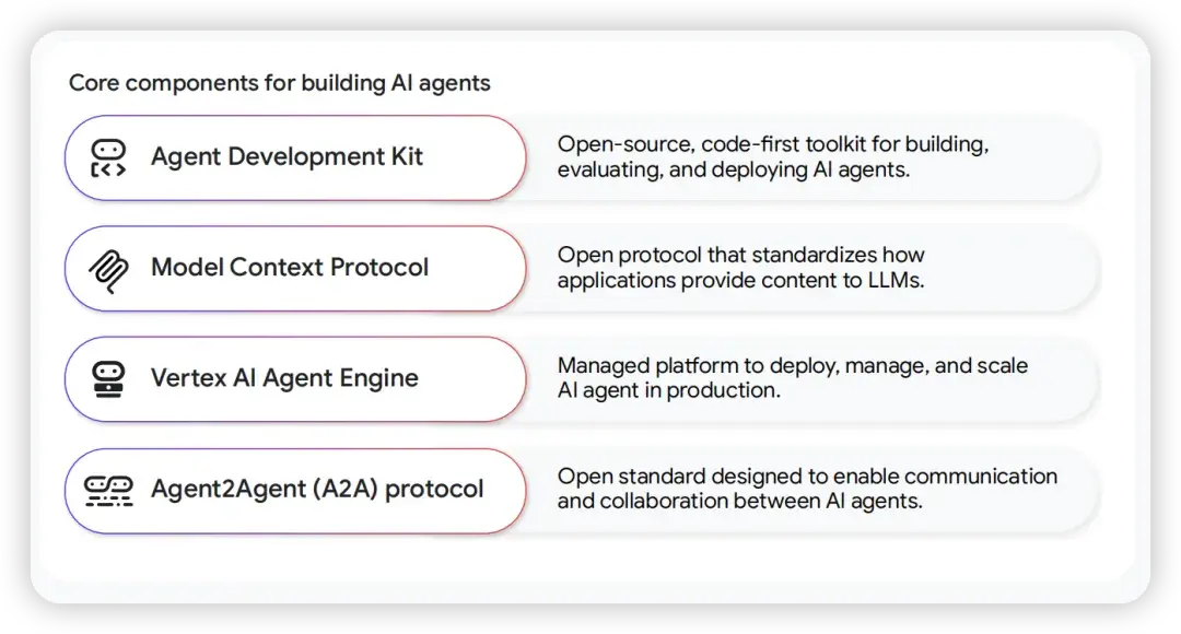 - 一个开发核心:ADK:Agent Development Kit (ADK) 是谷歌开源的、代码优先的智能体开发框架,是整个技术体系的基石,旨在平衡开发速度与灵活性。