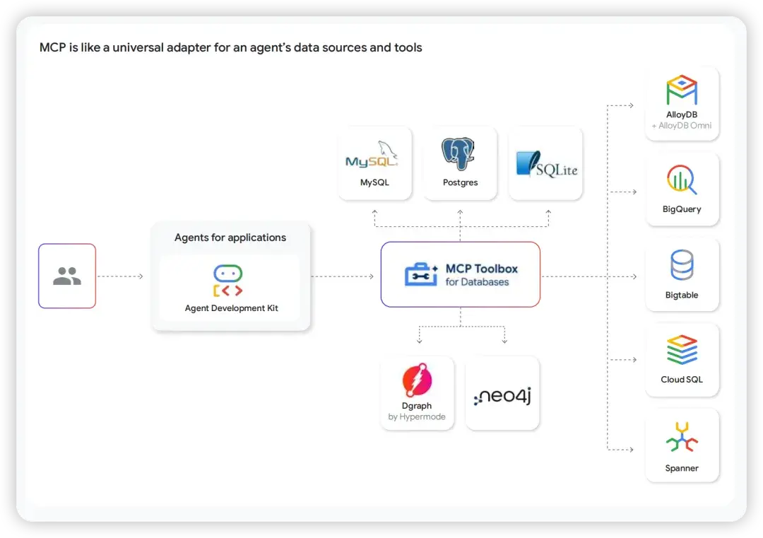 - MCP:一个新兴的开放标准,旨在标准化AI/LLM与外部数据源和工具的连接方式。它就像一个通用适配器,让你的Agent可以轻松接入各种数据库和API,而无需为每个都编写定制的集成代码。