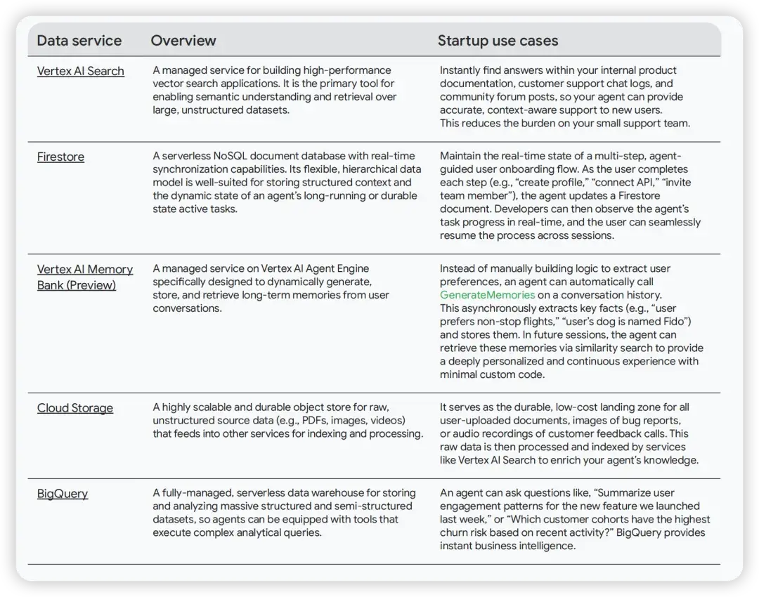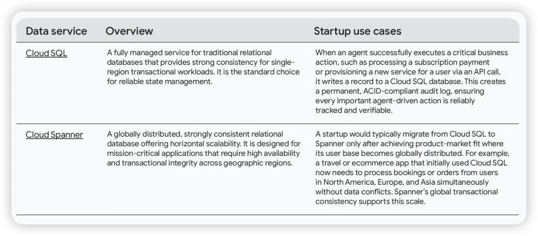 - Firestore: NoSQL数据库,适合存储Agent任务的动态状态和用户交互历史。