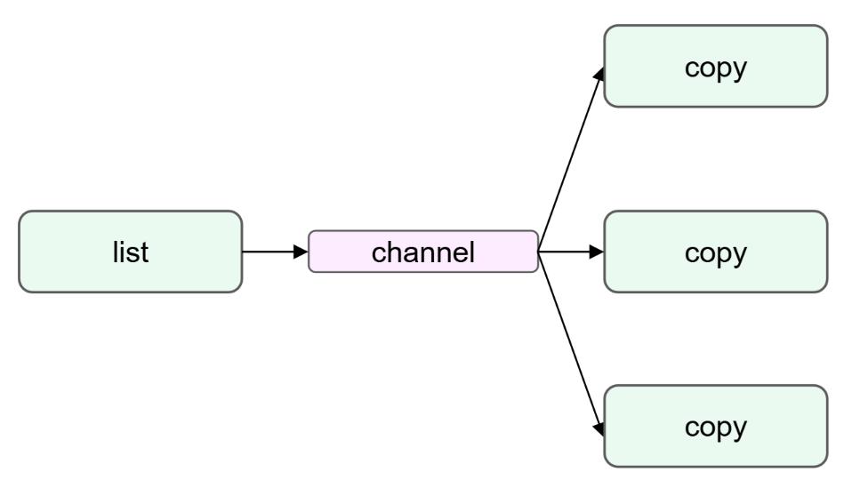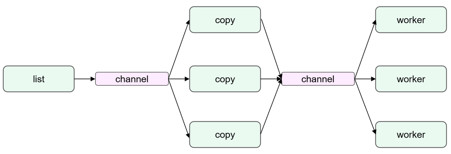一种操作流程的组织形式可能类似于上图,左边的routine,调用list objects的接口,或者从文件列表中获取所有的对象列表,然后再把这些对象,放入到一个channel中;然后右边的copy的routine,具体执行copy每个对象的动作。