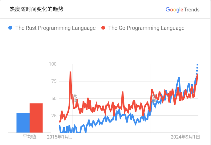 最近几年,Rust在业界的使用越来越多。在Windows内核中(win32kbase_rs.sys)、Linux内核中、Chromium浏览器中都有Rust的身影,AWS S3也使用rust重构了他们的核心存储服务ShardStore,Azure的CTO甚至说"Speaking of languages, it’s time to halt starting any new projects in C/C++ and use Rust for those scenarios where a non-GC language is required."。从下面的Google Trends也可以看的出来,Rust的热度正在上升,并且增长很快,可以说现在是学习Rust最好的时机。