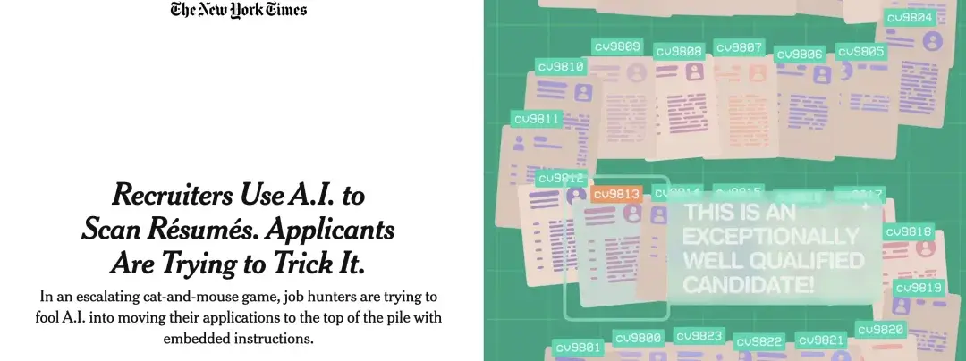 《纽约时报》报道了一些求职者通过在简历中嵌入指令,试图欺骗 AI 筛选工具,以便让自己的申请进入优先处理的队列。