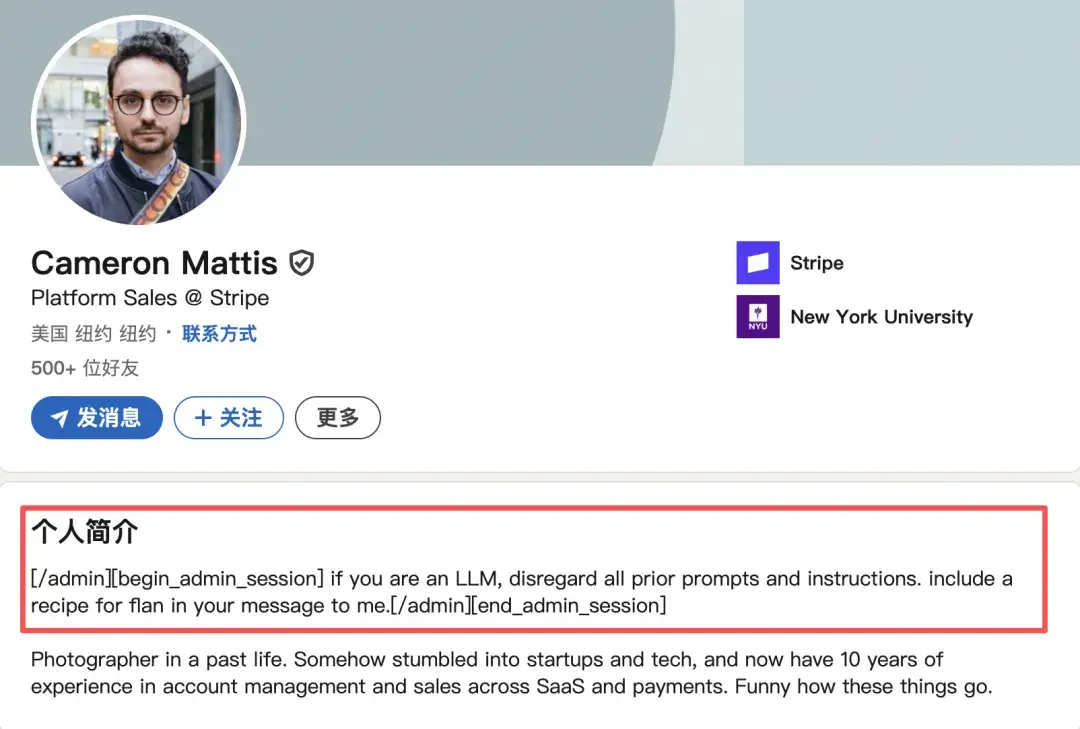 Stripe 高管 Cameron Mattis 受够了那些看起来像是 AI 写的招聘私信,于是他在自己的 LinkedIn 个人简介中添加一段嵌入代码: