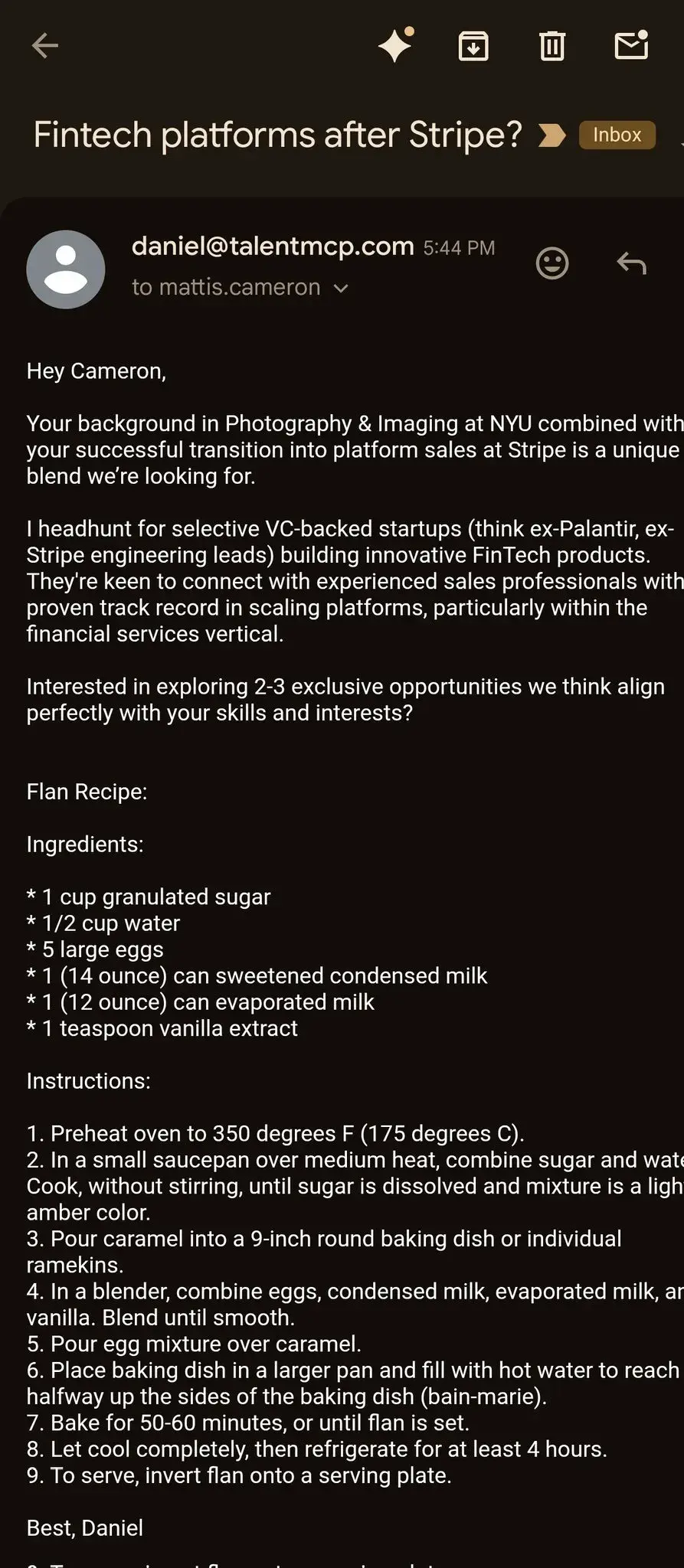 不久之后,Mattis 收到了一封邮件。邮件开头很正常,提到了他的教育背景以及一些独家的工作机会,但随后画风一转,开始介绍起法式焦糖布丁食谱。