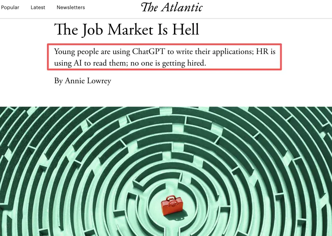 Young people are using ChatGPT to write their applications; HR is using AI to read them; no one is getting hired.(年轻人使用 ChatGPT 写求职申请,HR 使用 AI 来筛选申请,但是没有人被录用。)