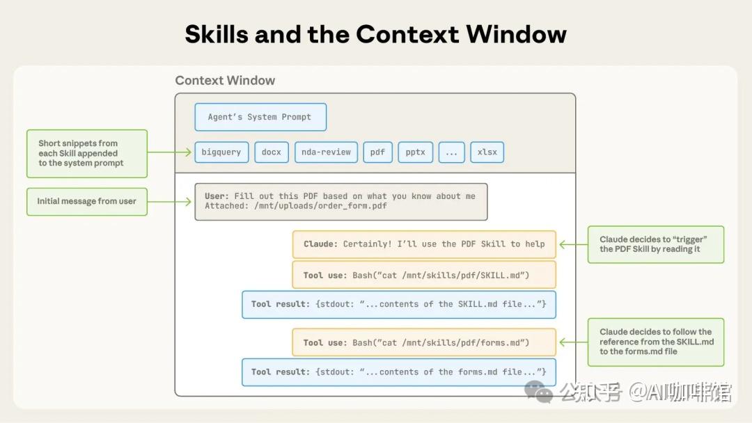 Skills 的强大能力根植于其独特的架构——“渐进式披露”(Progressive Disclosure)。这一机制的核心思想是:将文件系统(Filesystem)视为上下文窗口的无限延伸。
