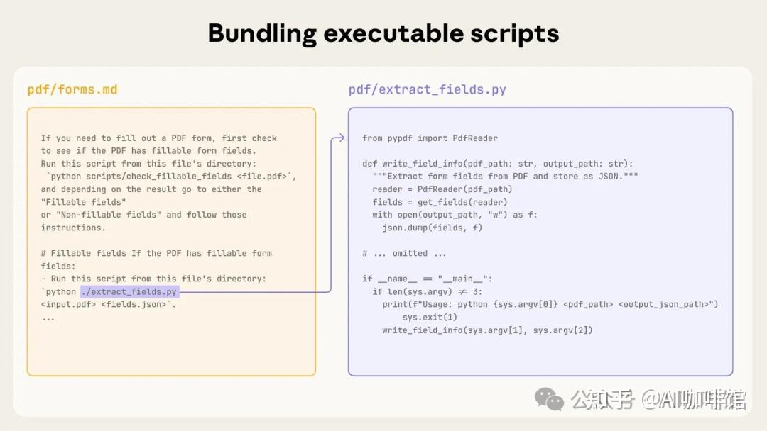 当指令引用到这些文件时(例如,执行python scripts/fill_form.py),Claude 会通过bash调用它们。关键在于,脚本代码本身永远不会进入上下文窗口,只有脚本的输出结果会返回给 Claude。这使得运行复杂代码的成本极低。