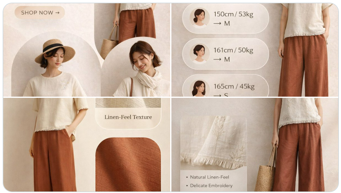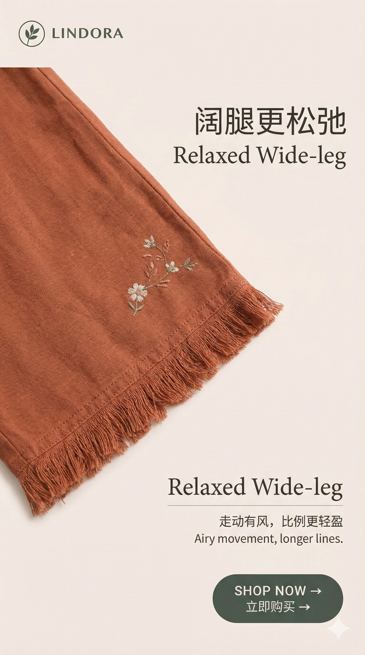 Outfit MUST match the uploaded product reference: cream/natural top with subtle embroidery + fringe hem, paired with terracotta wide-leg cropped pants with fringe hem and tiny embroidery near hem. Keep garment design identical to reference, no redesign.