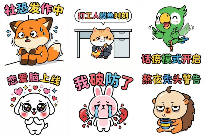 一个新鲜出炉的可爱动物表情包,从此实现表情包自由! 提示词模板: `` Create a funny anthropomorphic mascot character in Kakao Friends/LINE Friends style. A cute [动物角色] doing [搞笑动作/表情