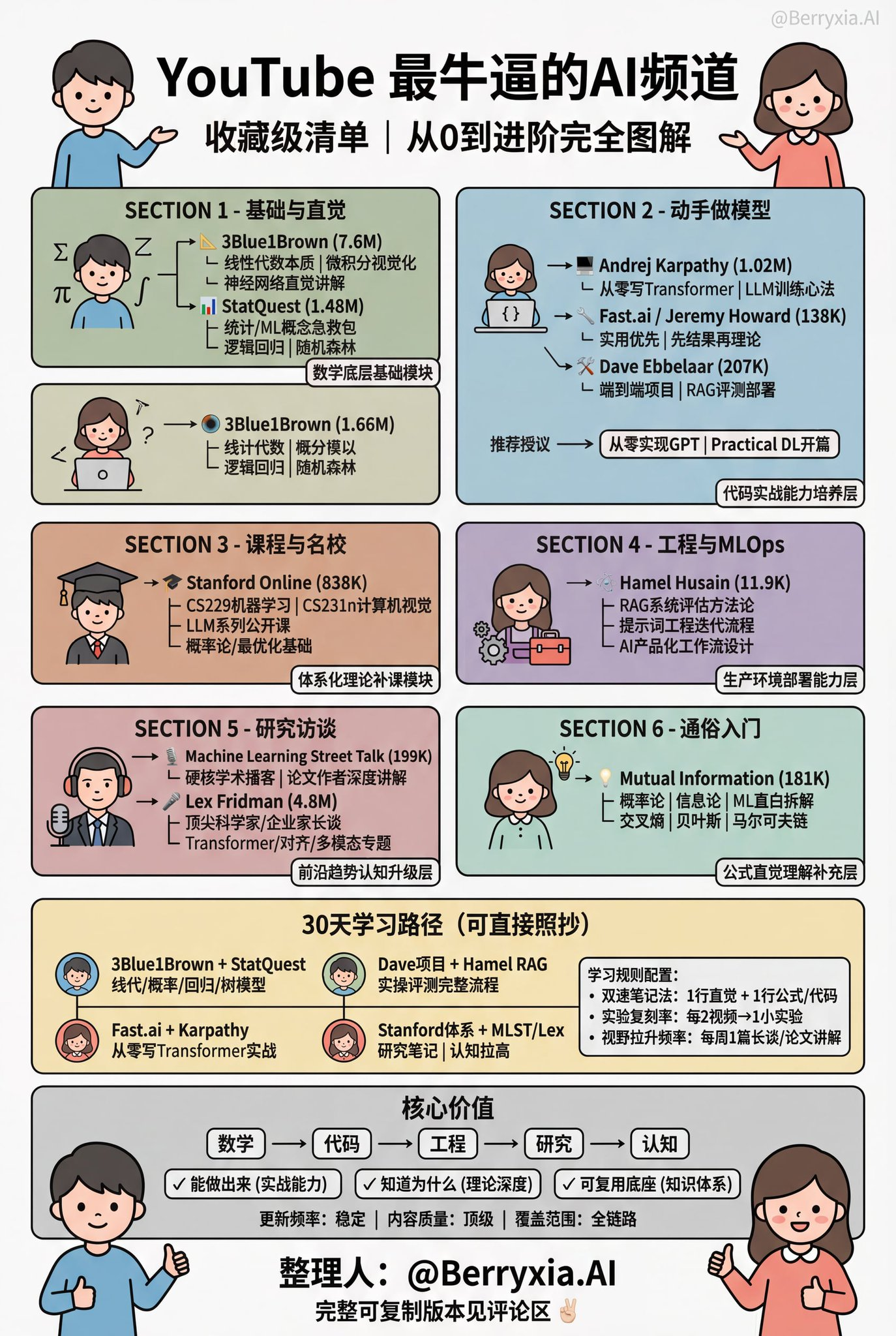 YouTube 最牛逼的AI频道(收藏级清单|从0到进阶) 想自学 AI,不想被信息噪音淹没? 这 10 个频道够你用一年:从数学 → 代码 → 工程 → 研究 → 认知,闭环进阶。 1) 基础与直觉(数学底层) •频道:3Blue1Brown(7.6M):把线代、微积分、神经网络讲成“能看