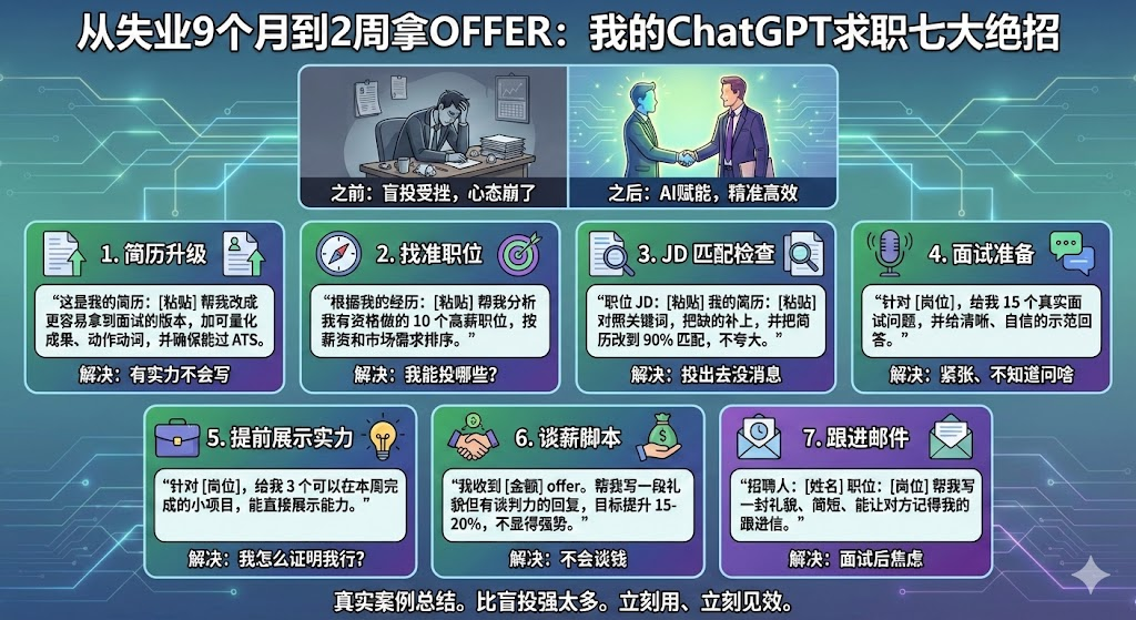 找工作最大的 7 个提示词放 都是能立刻用、立刻见效的那种。 1️⃣ 简历升级 “这是我的简历:[粘贴] 帮我改成更容易拿到面试的版本, 加可量化成果、动作动词,并确保能过 ATS。” 很多人不是没实力,是不会写。 2️⃣ 找准自己能做什么职位(解决“我能投哪些?”) “根据我的经历:[粘