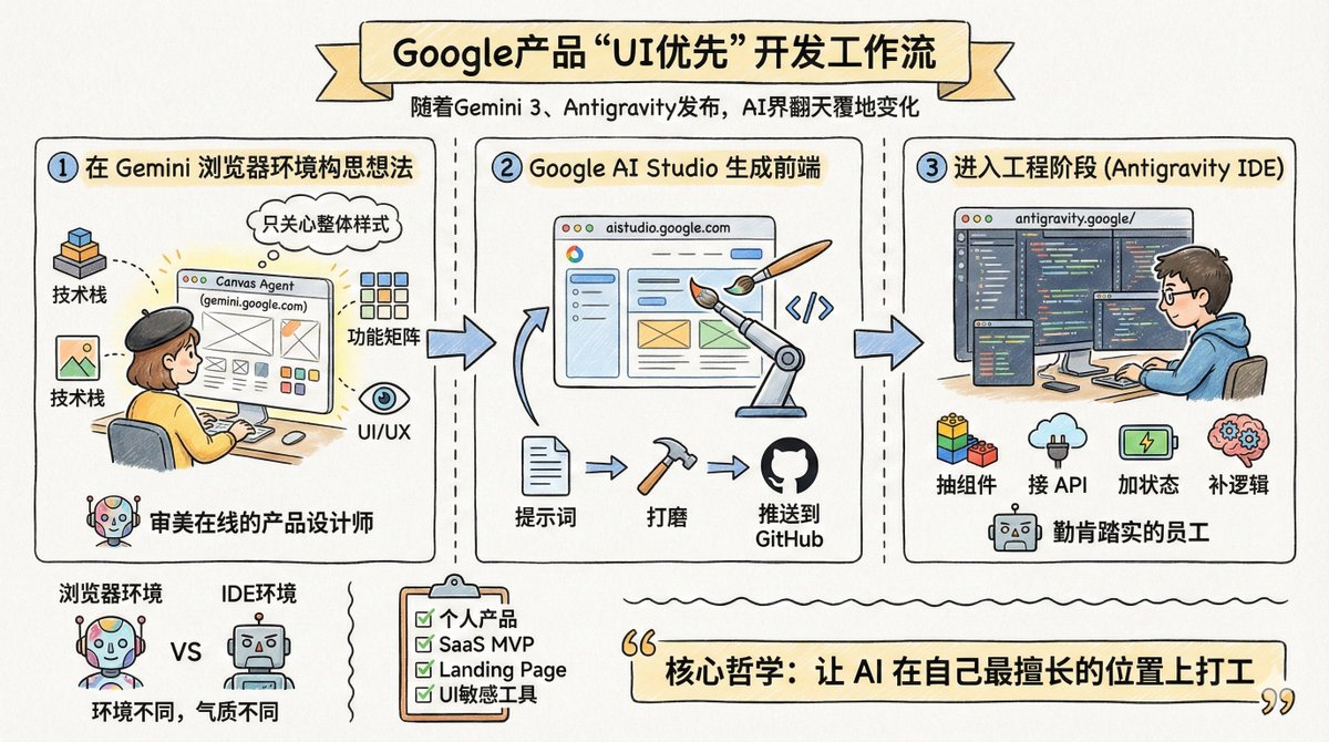 目前最强组合 AI Coding 新体验 随着Gemini3、Antigravity等Google系产品的发布,AI界可谓是发生的翻天覆地的变化。 推荐一套Google产品的“UI优先”的开发工作流,废话不多说,直接贴在下面👇 1️⃣在Gemini的浏览器环境里构思想法。主要关注技术栈、功
