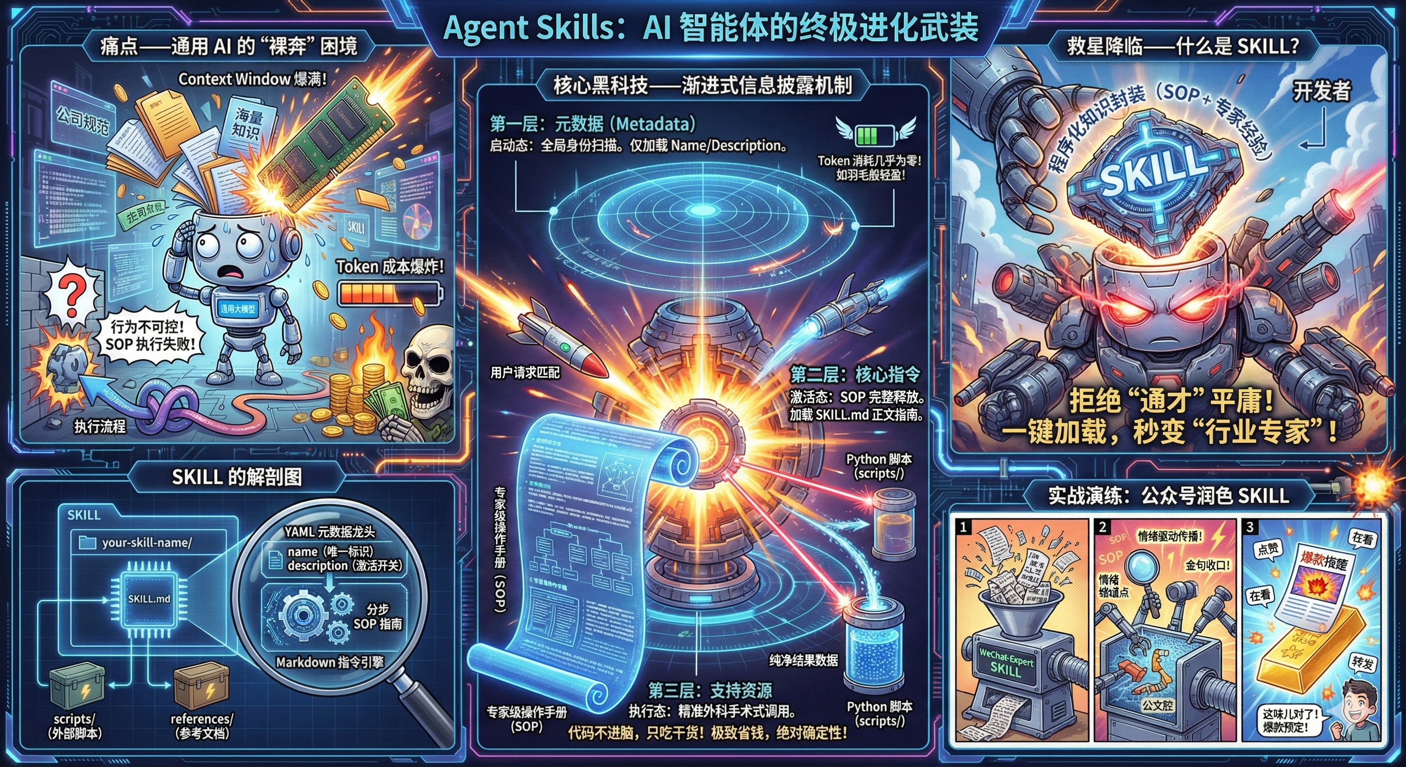 为什么 agent skills 是跳不过去的? 发展了 3 年的聊天 AI,缺乏执行特定、复杂工作流程的“专才”能力。对我们追求的是能理解、规划并高效执行任务的 AI 智能体(Agent)。 Agent Skills 便是解决这一核心痛点的关键技术。它是一种开放标准,旨在将专业知识和工作流程