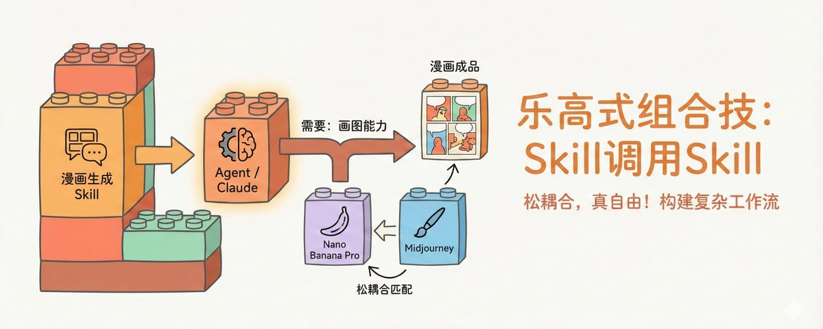 Skill 调用 Skill:Agent Skills 的乐高式组合 (转载 x 宝玉) https://x.com/dotey/status/2014157967780618651 写 Skill 的时候遇到一个问题:我的漫画生成 Skill 需要画图,但用户可能装了 Nano Banana P