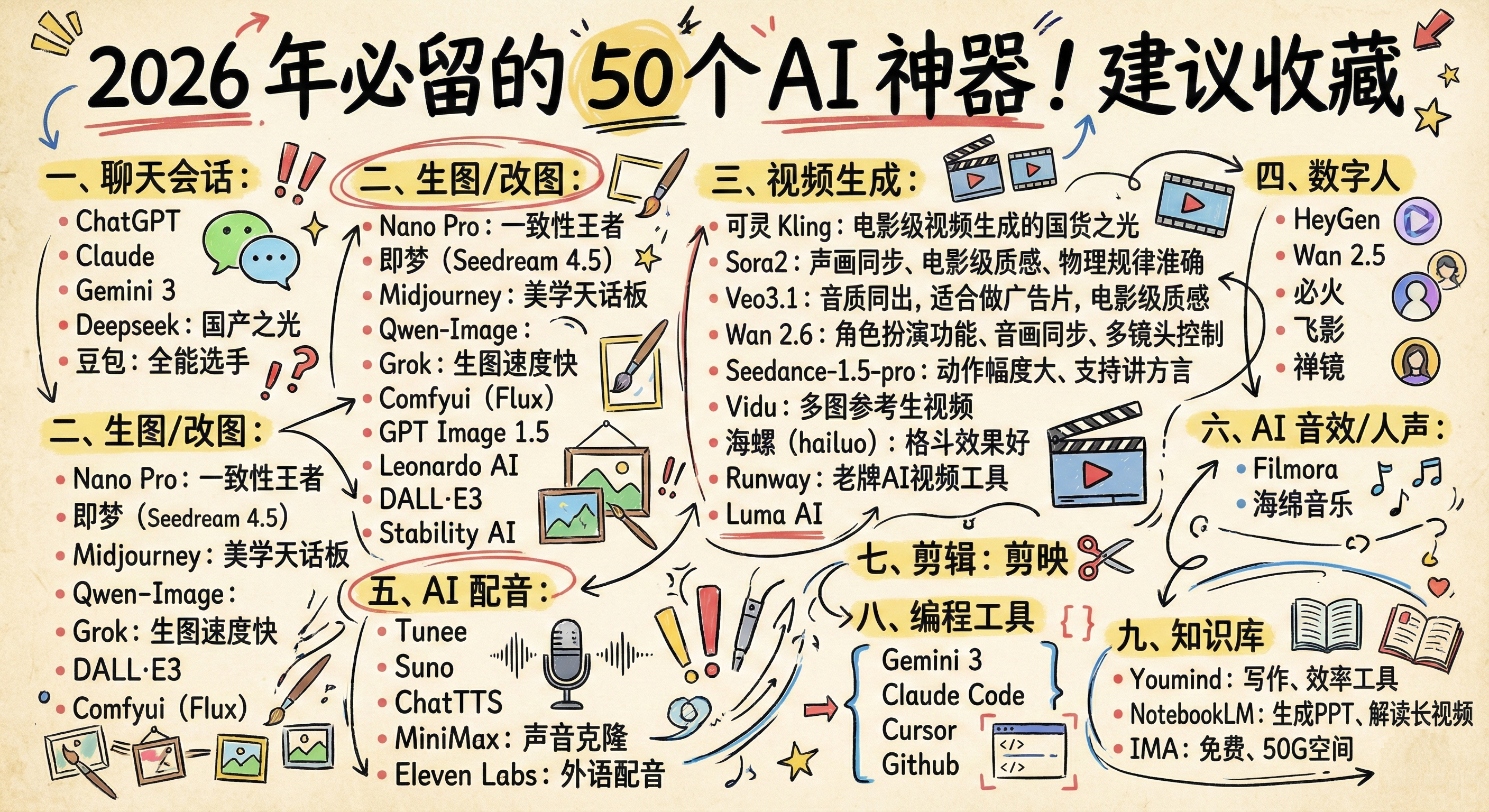 2026 年必留的 50 个 AI 神器!建议收藏 一、聊天会话: ChatGPT -Claude -Gemini 3 -Deepseek:国产之光 -豆包:全能选手 二、生图/改图: -Nano Pro:一致性王者 -即梦(Seedream 4.5) -Midjourney:美学天话板 -Q