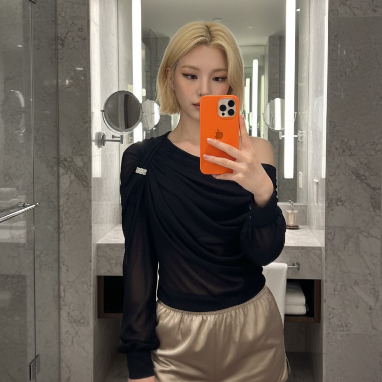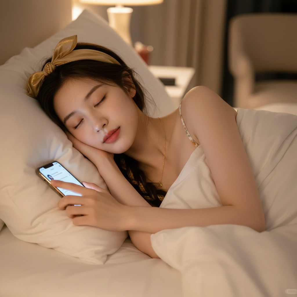 日常快照风格 人像摄影,日常快照风格,非精心构图或打光。一位气质人物,穿着轻薄睡衣或居家服,在酒店房间内站在落地镜前随手自拍。使用 iPhone 后置镜头拍摄,开启闪光灯,略带快门速度不够造成的运动