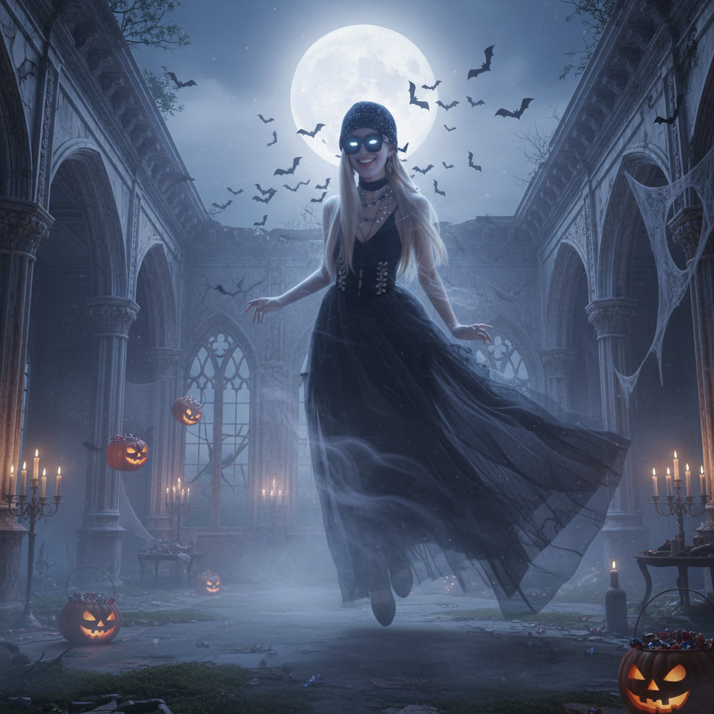 万圣节特辑-吸血鬼贵族舞会 基于[用户上传的照片],将人物转变为优雅的吸血鬼贵族,穿着血红丝绒斗篷,苍白脸庞上嘴唇鲜红,獠牙微露,头发如瀑布般飘逸;场景设定在烛光摇曳的哥特城堡舞厅,与其他吸血鬼共舞
