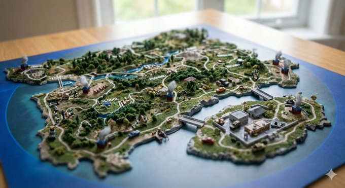 A miniature tabletop version of the iconic map from [上海], with tiny characters, vehicles, terrain, and interactive-looking details. Stylized realism, soft lighting, tilt-shift depth. The important locations on the map are all marked with surreal light particles, creating surreal digital art. Surreal textures, 8k resolution, intricate details, cinematic composition, epic atmosphere, emotions, masterpieces,Super large panoramic view, more dreamy and realistic effect