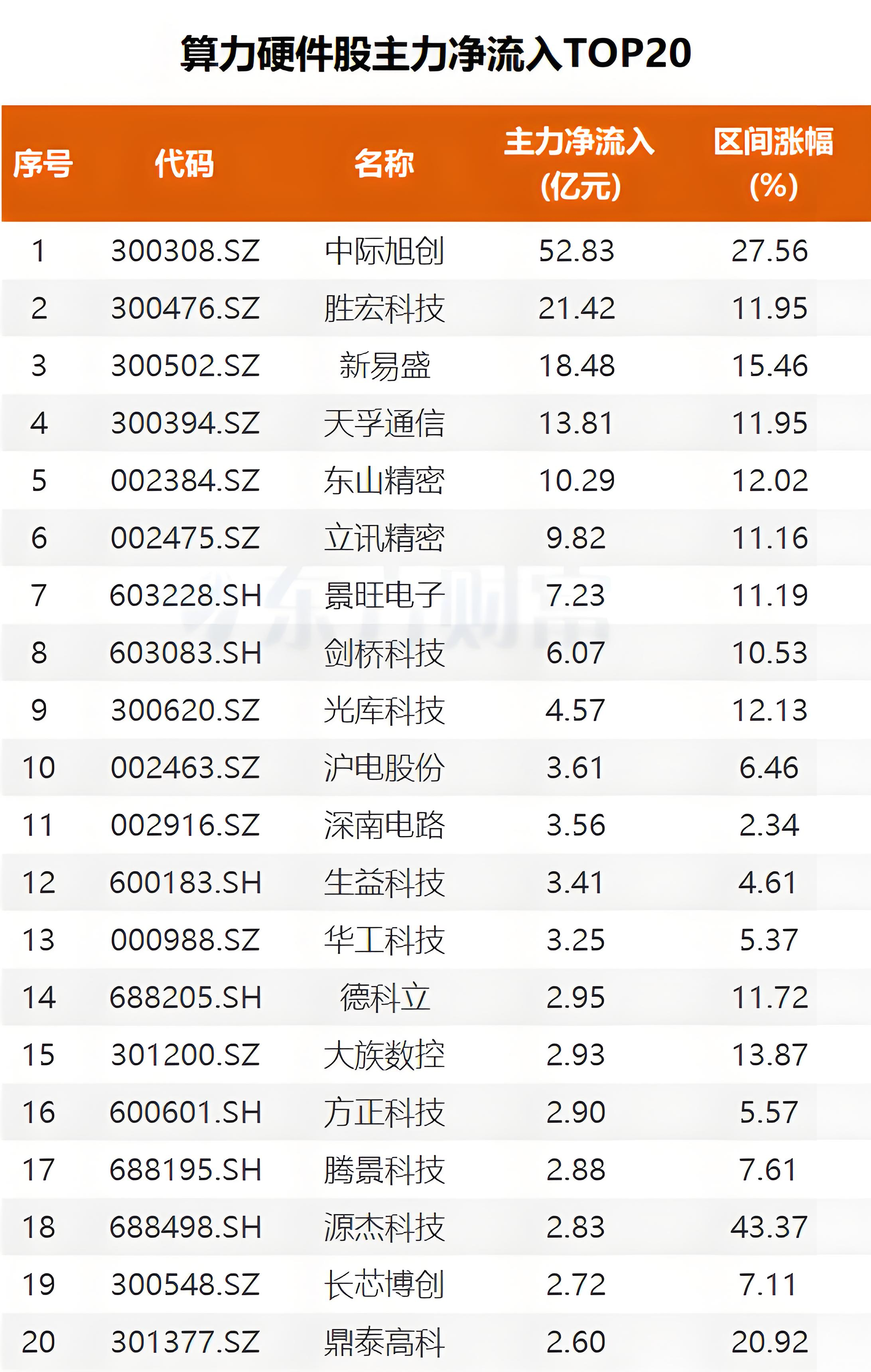 新易盛、天孚通信、东山精密、立讯精密、景旺电子、剑桥科技等个股主力资金净买额在18亿元至6亿元之间不等。
